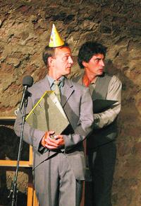 (giessen 15. september 2008) Saukalt draußen, aber schön mal wieder zu Hause zu sein. Die Premiere vom „Bandscheibenvorfall“ ist gelaufen. Und so weit ich in der Lage bin dies einzuschätzen, sogar recht erfolgreich. Schön zu sehen, wie so mancher Zweifel zum Aha – Erlebnis mutierte. Noch erfreulicher war zu sehen, daß es kaum Gründe gibt bei der Arbeit an der Verständnisbereitschaft und Intelligenz eines Publikums zu zweifeln. Zum einem bewegt man sich da zwangsläufig im spekulativen Bereich, zum anderen implizieren solche Gedanken automatisch eine wie auch immer geartete Überlegenheit der „Kulturschaffenden“. Die ersten Kritiken sind in dieser Beziehung erfreulich. Ein letztes Urteil kann natürlich erst am Ende der Vorstellungsreihe gefällt werden. Des weiteren würde ich mir manchmal wünschen, man würde die Berufsbezeichnung Schauspieler durch "Erzählarbeiter" ersetzen.